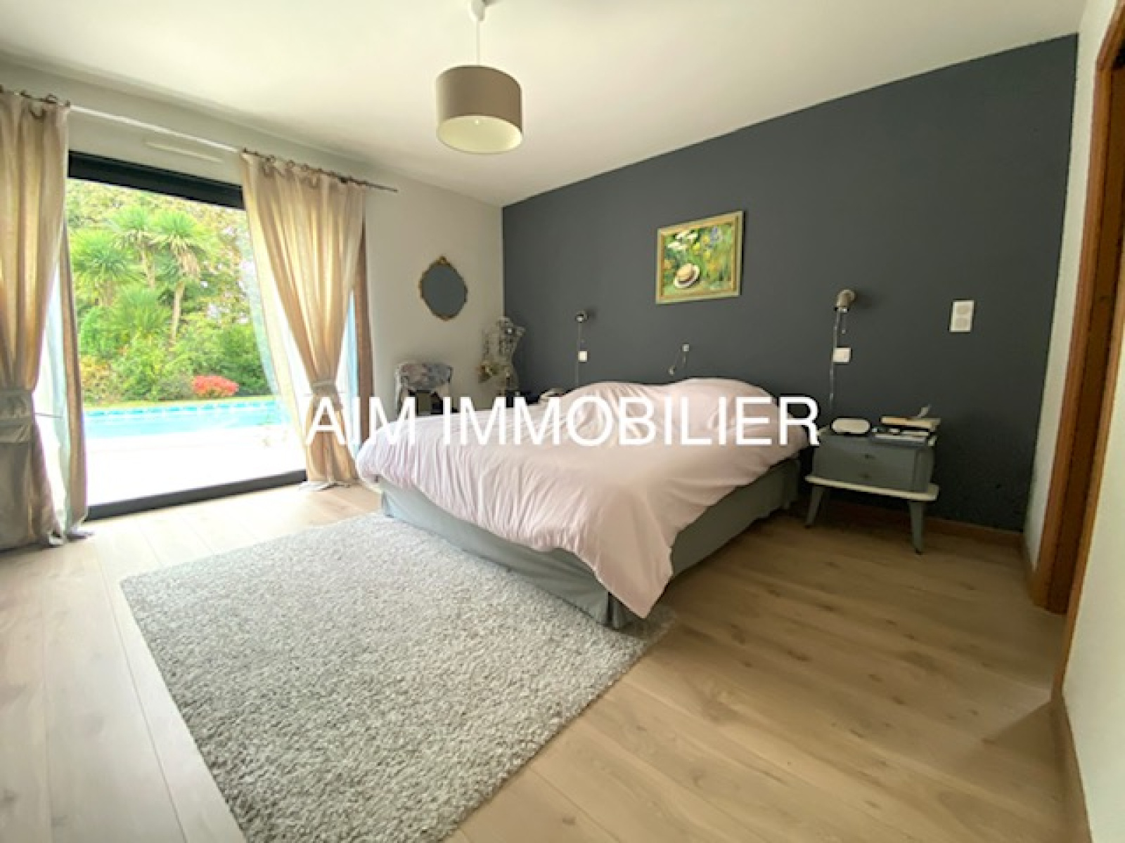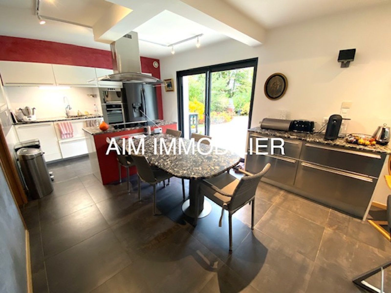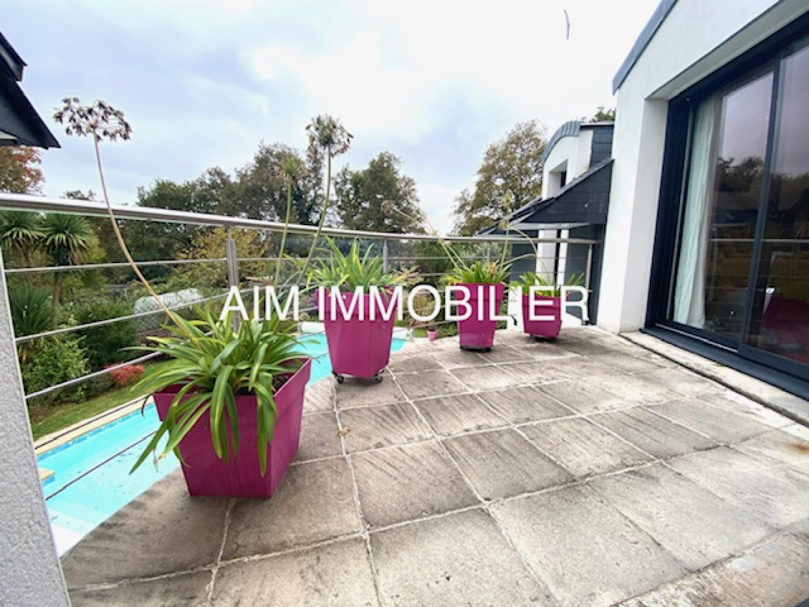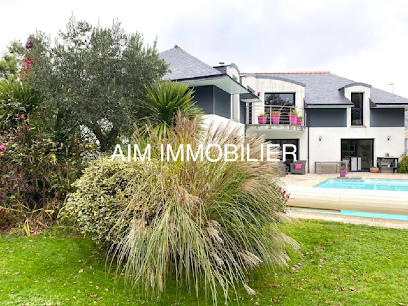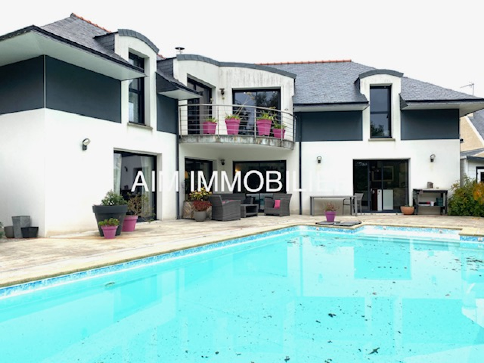 ()Maison contemporaine avec piscine à vendre Vannes- Vous serez charmés par cette villa, située à 10 minute du centre ville de Vannes proposant une vie de plain pied aux volumes généreux. Dès l'entrée, vous remarquerez la très grande pièce de vie proposant un coin cuisine, et un vaste séjour, salle à manger tournés autour du poêle central. Un plafond cathédral distingue cette pièce de vie. Une suite parentale permet de bénéficier d'une vie de plain pied. A l'étage: une vaste mezzanine desservant une chambre avec salle d'eau privative, deux autres chambres, une salle d'eau. Cellier, double garage. Une pièce aménagée au-dessus du garage pouvant faire office de bureau, salle de jeux ou autre. Toutes les pièces de cette maison sont tournées autour de la terrasse et de la piscine chauffée. Vous pourrez profiter d'un très beau jardin clos et arboré. Très beau produit.