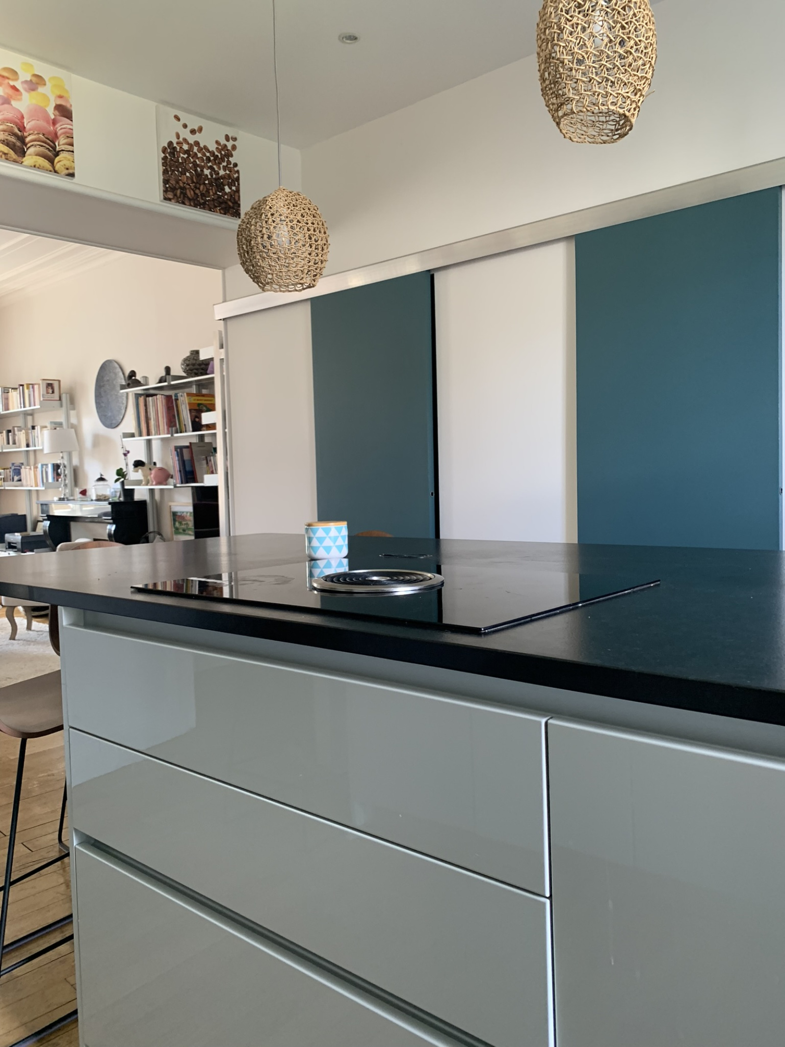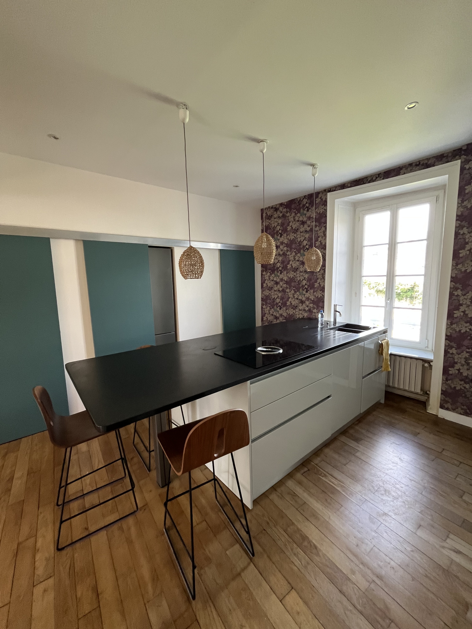 Dès l’entrée, la lumière s’invite, révélant une pièce de vie aux beaux volumes, sublimée par le cachet d’éléments anciens savamment conservés. La cuisine dinatoire, au design épuré et chaleureux, appelle à la convivialité.