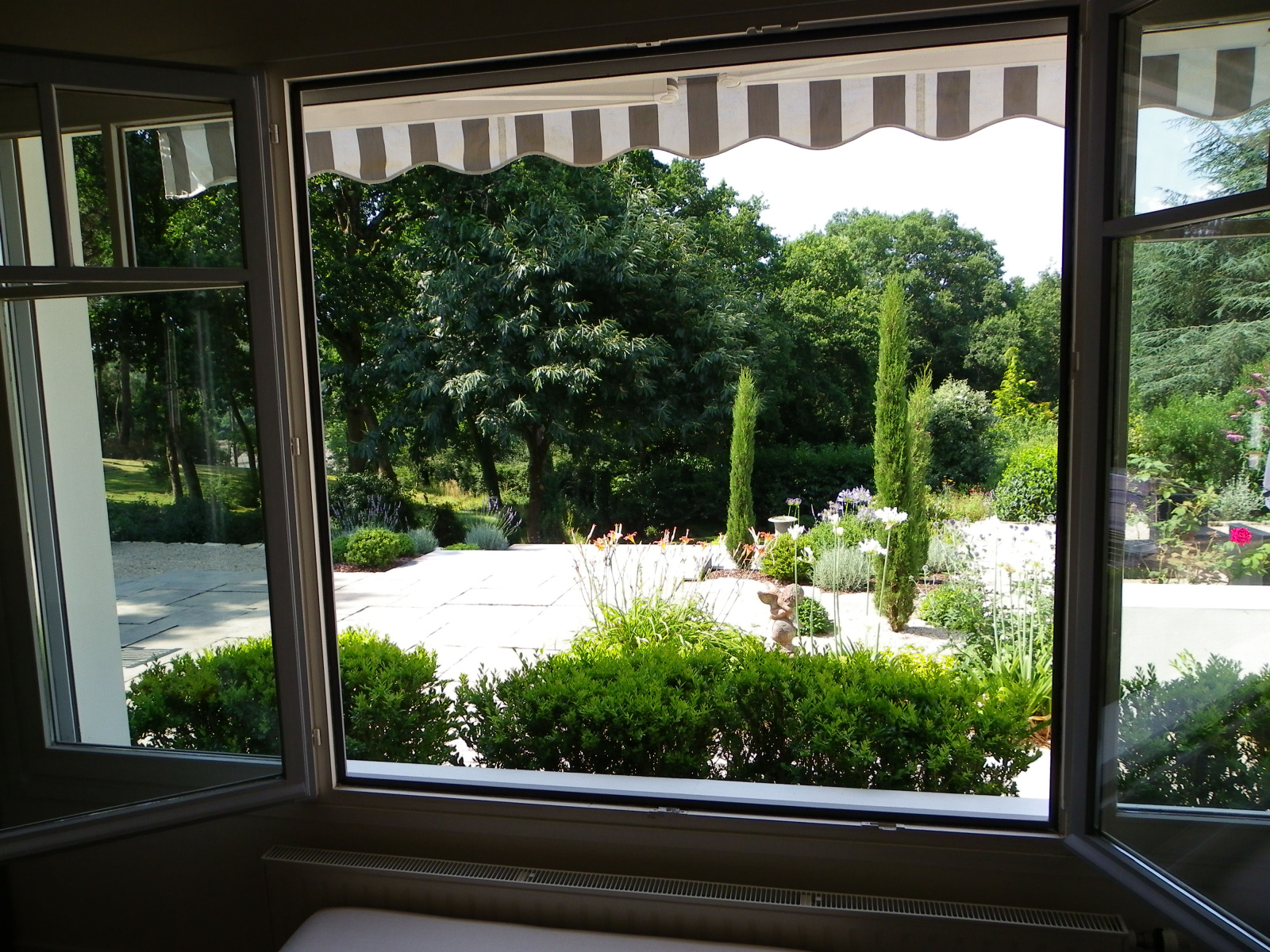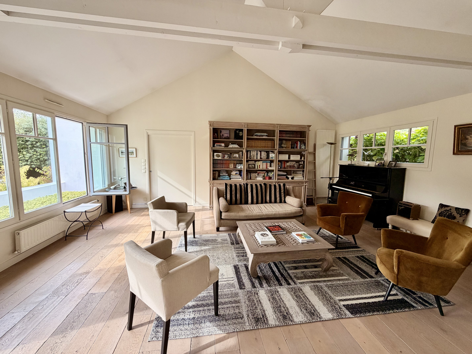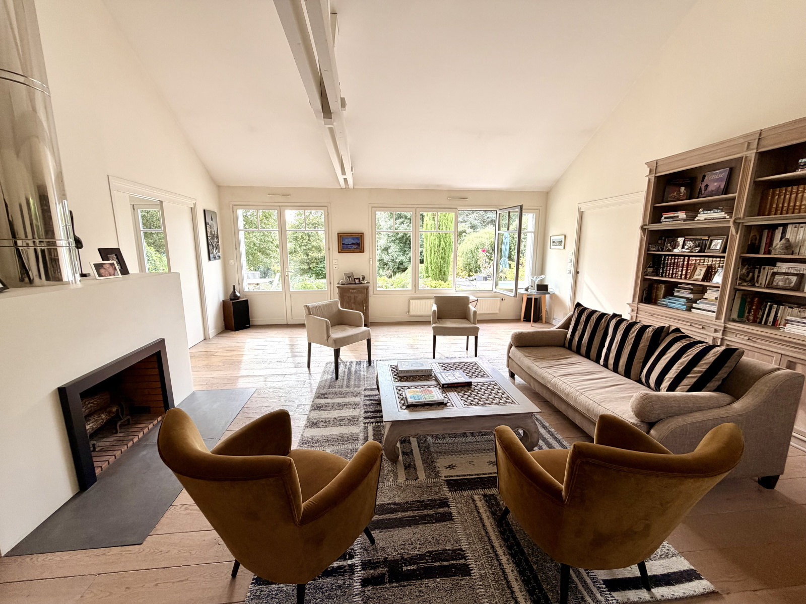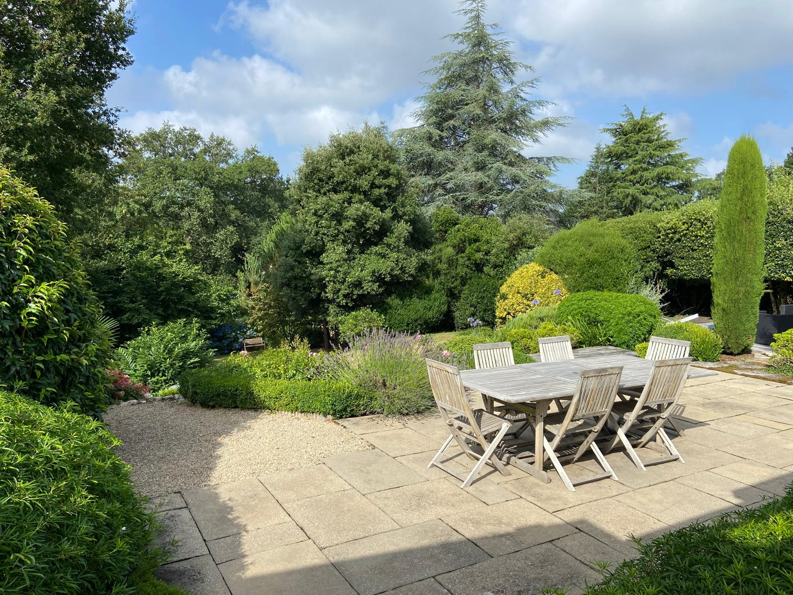 Le séjour, véritable espace de convivialité, se déploie avec élégance, ouvrant sur une salle à manger et une cuisine séparée. Ces pièces s’ouvrent sur une belle terrasse, véritable prolongement de l’espace intérieur, où vous pourrez profiter du jardin magnifiquement paysagé et arboré, véritable havre de paix.