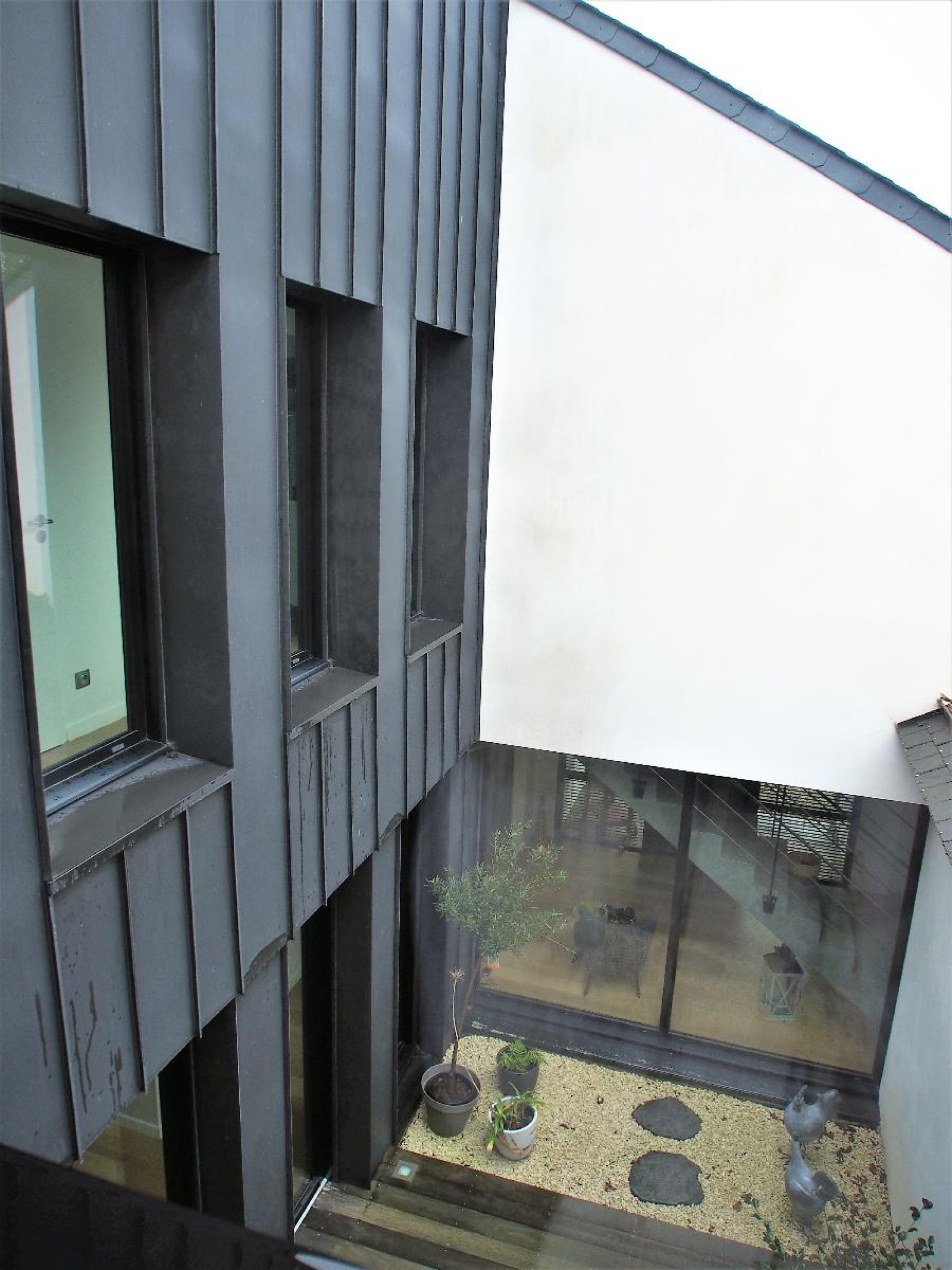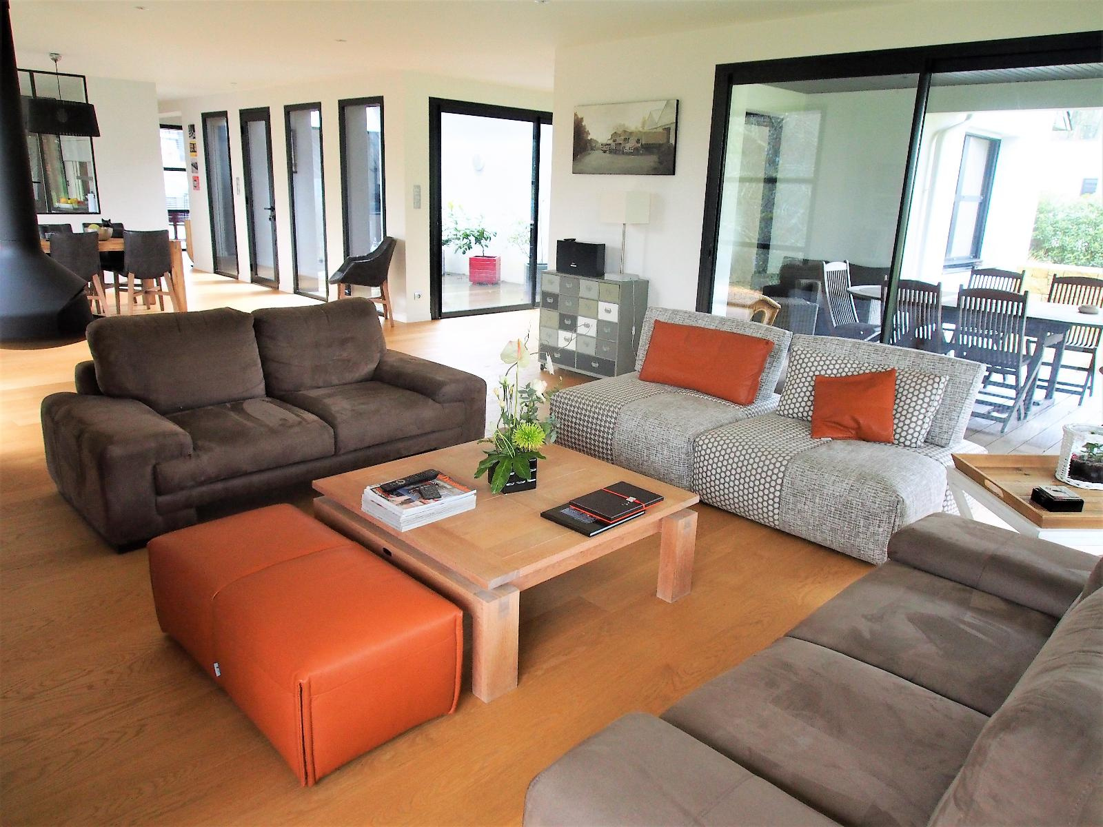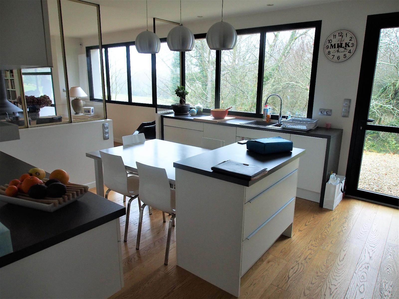 Vannes (56000)Maison contemporaine à vendre Vannes- Dès l'entrée, vous serez immédiatement séduits par cette maison contemporaine alliant le charme par ses matériaux nobles et un esprit contemporain. L'entrée, illuminée par un patio, vous conduit à une très belle pièce de vie faisant office de séjour, salle à manger, entièrement ouverte sur l'extérieur par ses vastes espaces vitrés. Dans la continuité, vous apercevrez la cuisine semi-ouverte. Un coin nuit offre un espace bureau, une suite parentale avec chambre, dressing et salle d'eau. L'escalier en béton ciré amène à une vaste mezzanine, une chambre avec salle d'eau privative, deux autres chambres et une salle de bains. Parc arboré. Très belle construction. Coup de c?ur assuré.