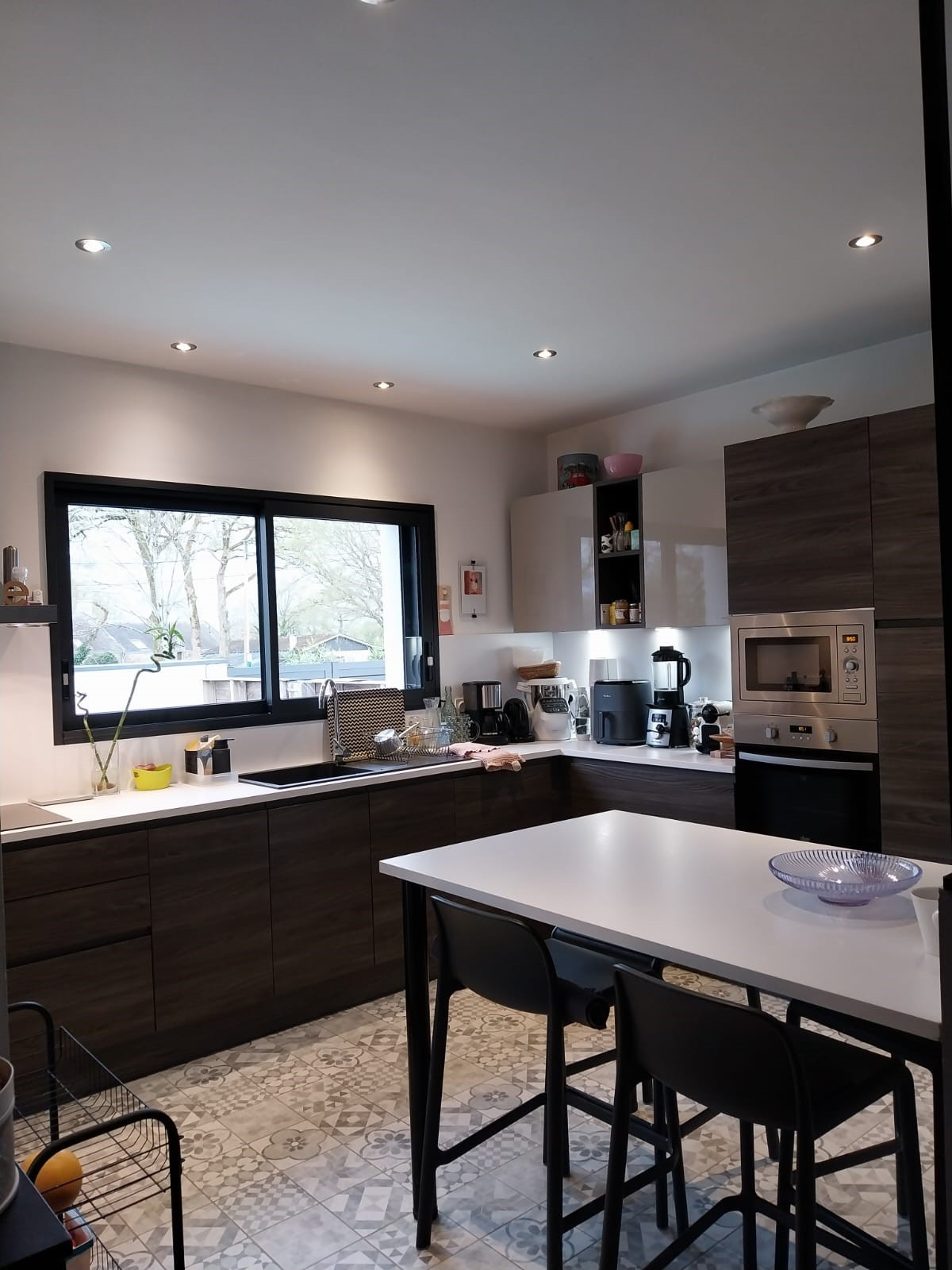 La cuisine semi-ouverte, fonctionnelle et élégante, complète harmonieusement l’espace de vie. Un salon TV, un bureau et une chambre de plain-pied avec salle d’eau privative complètent le rez-de-chaussée.