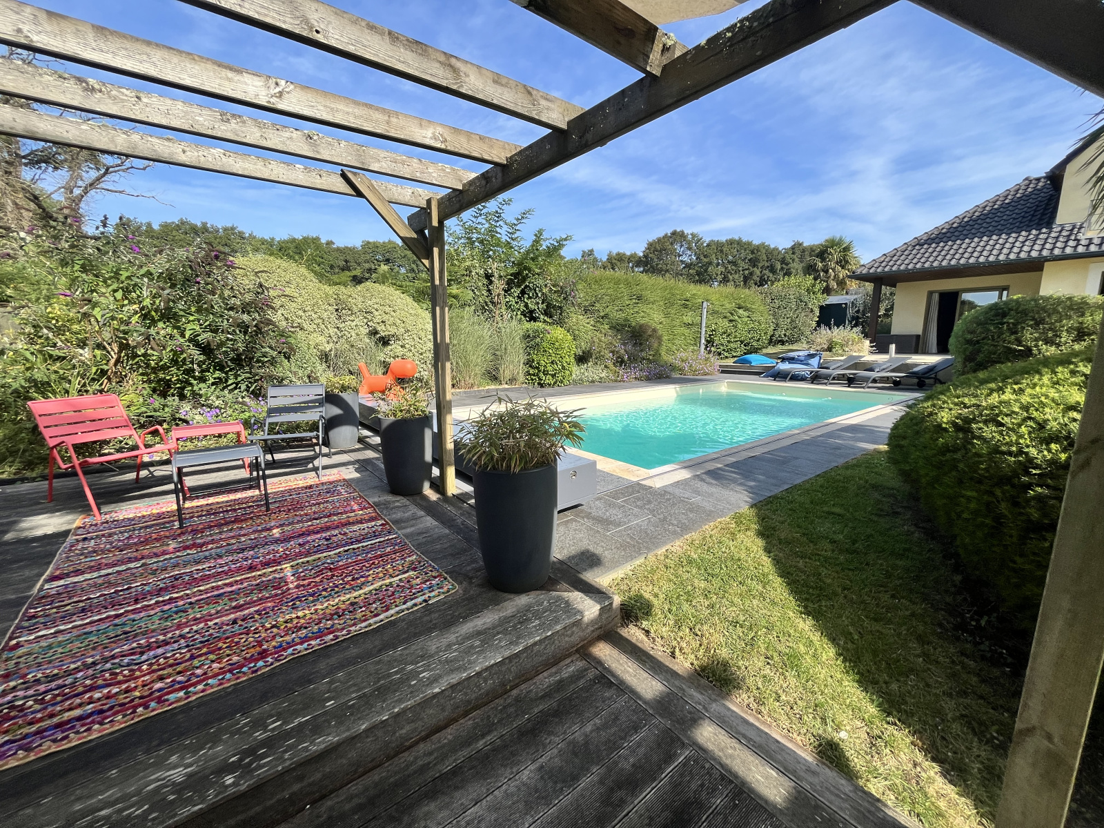 À l'extérieur, un magnifique jardin arboré accueille une piscine, idéal pour se détendre à l'abri des regards. Une dépendance complète cet ensemble avec une cuisine, un petit séjour et une chambre, parfait pour recevoir en toute intimité.