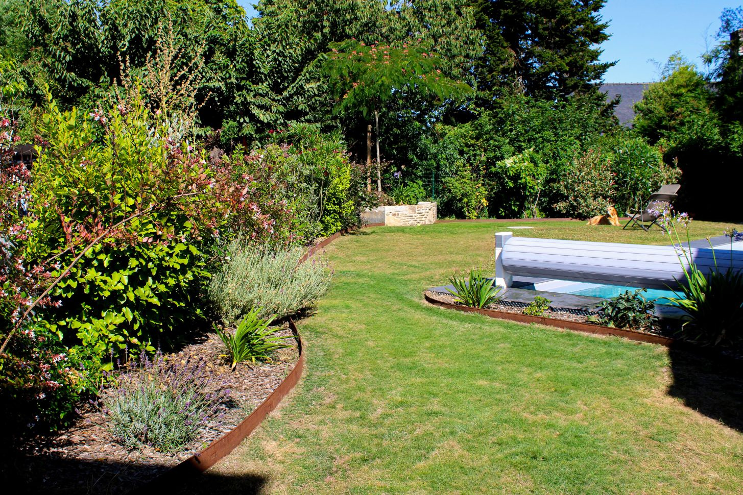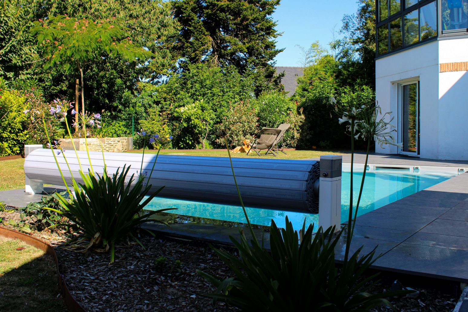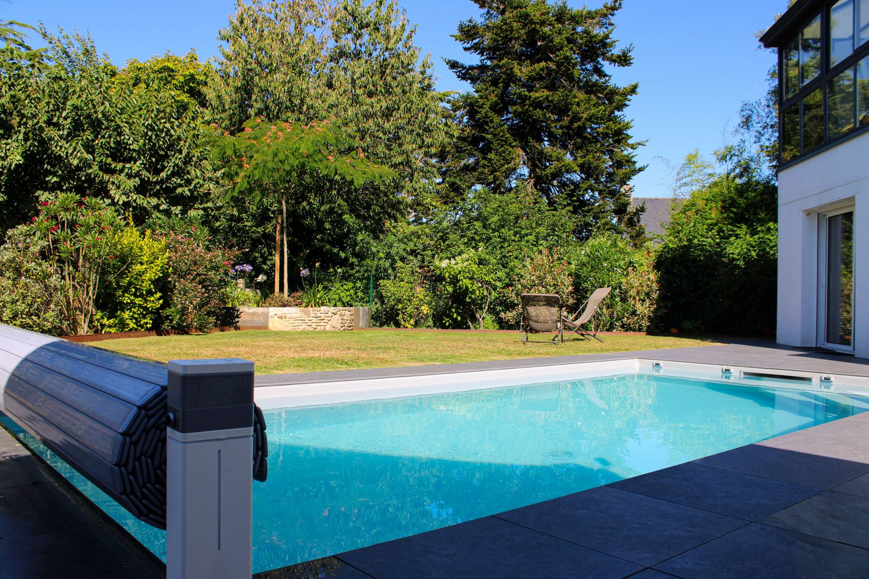 Un jardin paysager avec piscine au sel automatique chauffée et connectée idéal pour profiter d’un cadre de vie de plain-pied