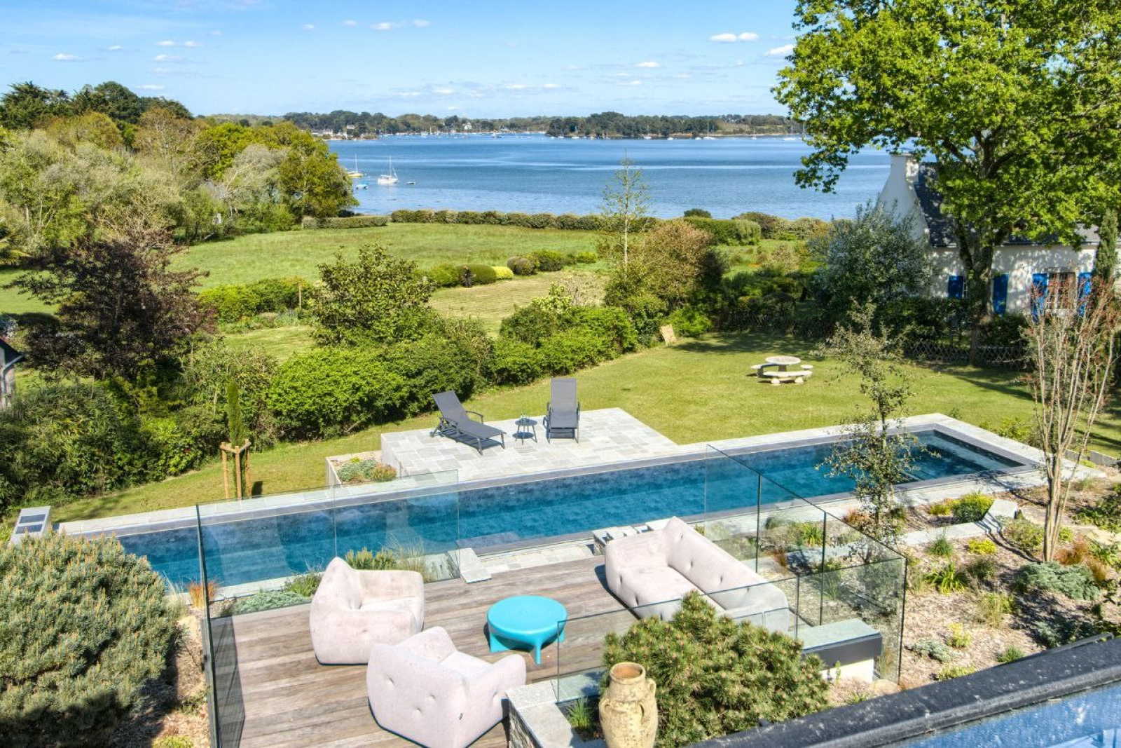Les extérieurs prolongent l’art de vivre de cette propriété de prestige : une large terrasse orientée vers la mer, un parc arboré soigneusement paysagé et une piscine longue de 18 mètres avec spa intégré, offrant des moments de détente absolue dans un environnement confidentiel.