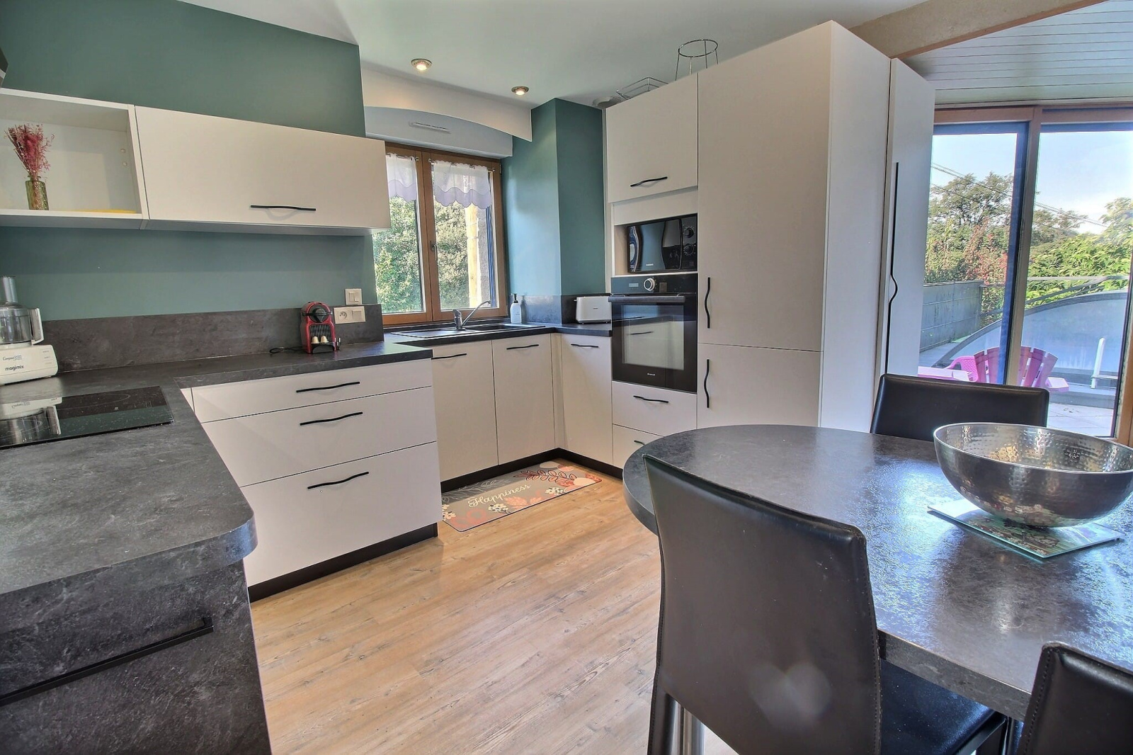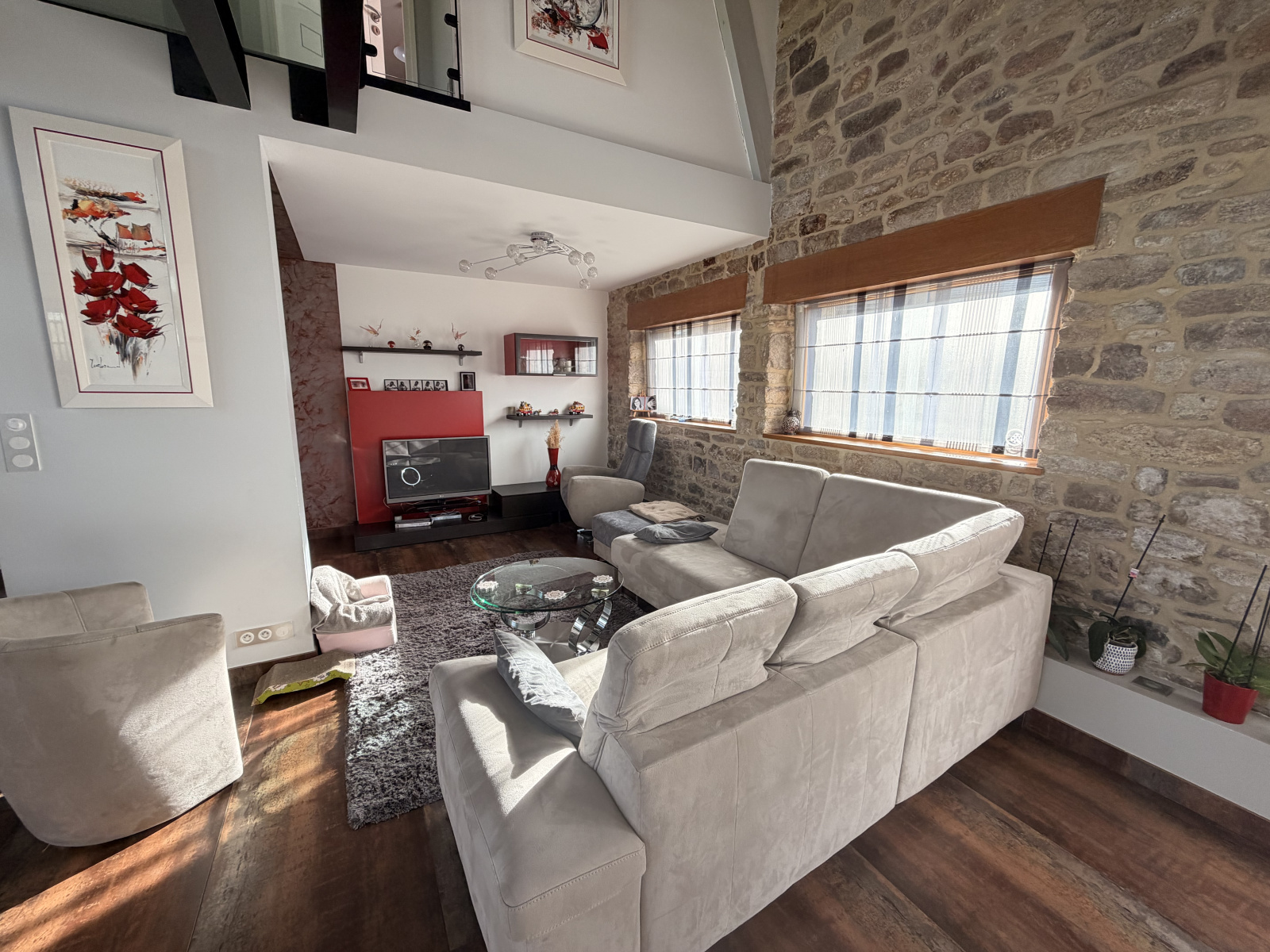 La maison principale, issue de la rénovation d’un ancien moulin en pierre, séduit par une magnifique pièce de vie ouverte sur l’extérieur, bénéficiant d’un panorama remarquable sur la campagne environnante.Les volumes, la lumière naturelle et les matériaux nobles confèrent à cet espace une atmosphère chaleureuse et raffinée.